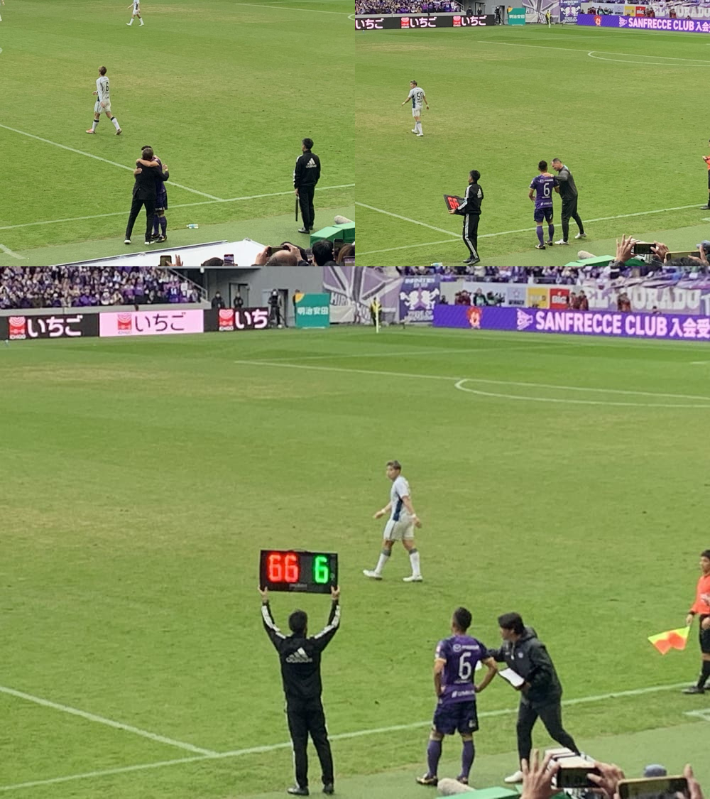 ここで、今季で引退する青山選手、サンフレッチェ広島と契約満了となる「柏 好文」選手が選手交代で立て続けにピッチに立ちます。両選手とも大きな拍手で迎え入れられました!